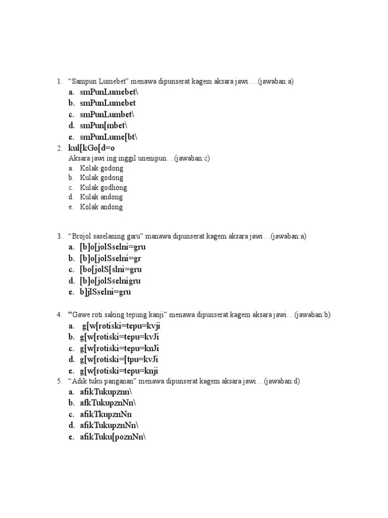 Gatekno pacelathon ing ngisor iki! Membuat soal pilihan ganda memang gampang gampang sulit apalagi kala diperintahkan oleh guru untuk membuat soal pilihan ganda demi mendapatkan nilai nah bagi kalian yang sedang mencari contoh soal pilihan ganda berikut saya bagikan contoh pilihan ganda dan jawabanya materi bahasa jawa kelas x. Homepage / contoh soal aksara jawa. 7 aksara swara aksara vocal yang sebaiknya anda pahami. Tidak seperti aksara carakan, pada aksara swara …